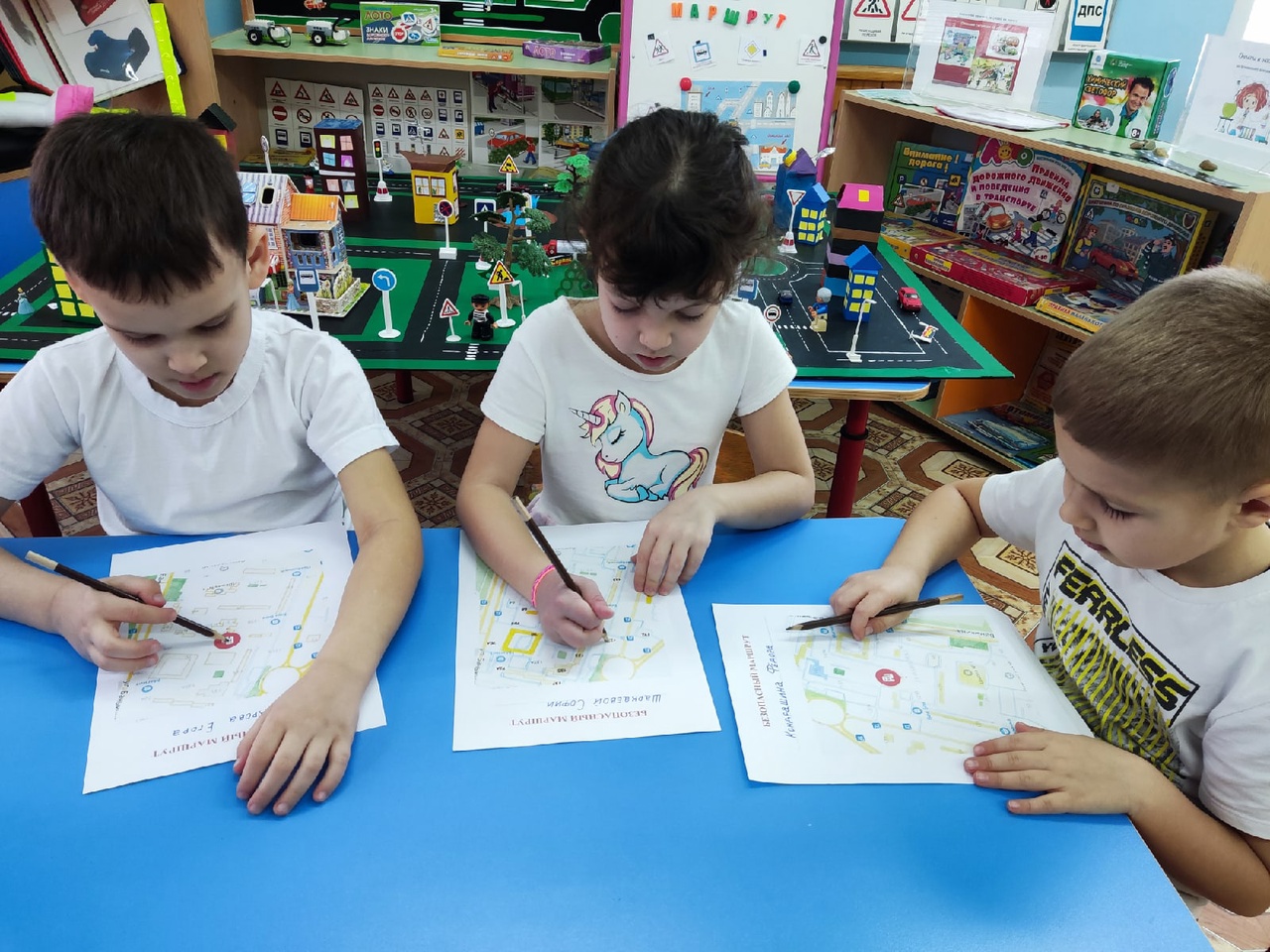 Сегодня дошколята моделировали опасные ситуации, в которые может попасть пешеход. Проводили эксперименты, обсуждали, что при большой скорости транспортному средству трудно остановиться. Чертили и обсуждали «Безопасный маршрут» от дома до детского сада, а также вспомнили правила прехода через проезжую часть.